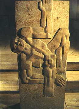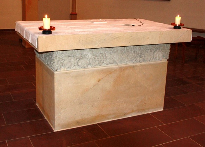 Das Lesepult (Ambo) zeigt einen Menschen des 20. Jahrhunderts: kräftig und stolz - aus eigener Kraft meint er alles zu schaffen. Hier liegt er am Boden. Hilfesuchend streckt er einen Arm aus. Dabei berührt seine Hand das Wort Gottes, das von dieser Stelle verkündet wird. Die Evangelien erzählen uns von den Worten und Taten Jesu. Sie berichten über sein Leiden und seine Auferstehung und bezeugen ihn als den Sohn Gottes. Sie wollen den Hörer zum Leben aus dem Glauben führen. Das Jesuswort vom Weinstock und den Reben findet hier seine Fortsetzung: "...denn getrennt von mir könnt ihr nichts vollbringen."