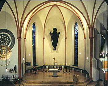 Der Altarraum bestimmt das Geschehen während Eucharistiefeier. Bei Einfall des Sonnenlichts können die farbigen Glasfenster, geschaffen von dem Schönebecker Künstler Christof Grüger (externer Link), zu einem Symbol des Lichtes Gottes werden. Die Feier der Auferstehung ist die Mitte des Gottesdienstes. Die große Christusfigur erinnert an den auferstandenen Jesus. Christus ist der eigentliche Herrscher über Himmel und Erde. Er wird wiederkommen, um den "neuen Himmel und die neue Erde" zu vollenden. Die Schöpfung ist in seiner Gegenwart geborgen.